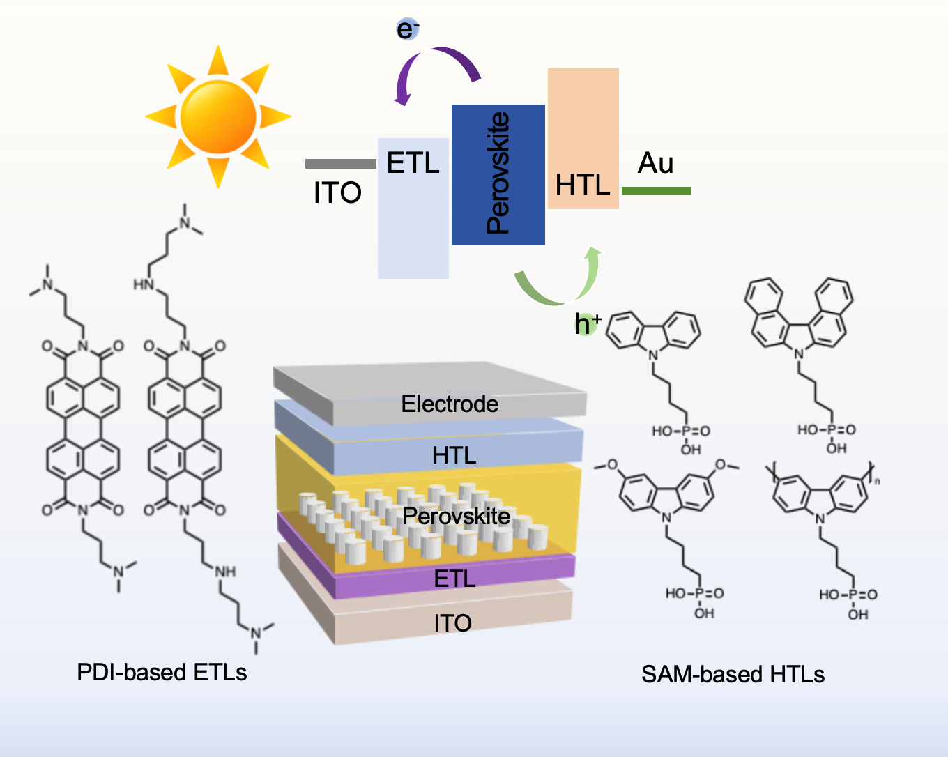 Molecular engineering of interfacial materials to improve efficiency and stability in organic/ perovskite solar cells